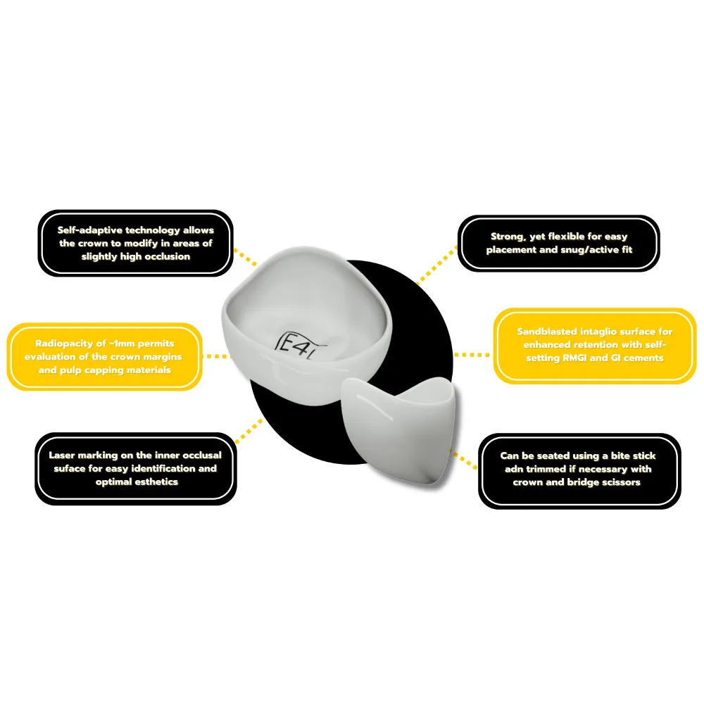 • Laser marking on the inner occlusal surface for easy identification and optimal esthetics.