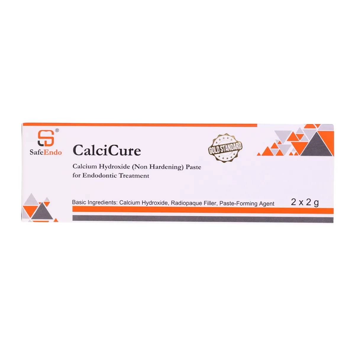 SafeEndo CalciCure Calcium hydroxide forms an alkaline medium (pH12.8) which provides long antibacterial effect and results in formation of dental-cement barrier. That creates conditions for growth and formation of tooth root, regeneration of bone and periapical tissues, increases pulp regeneration ability and stimulates formation of secondary dentine.