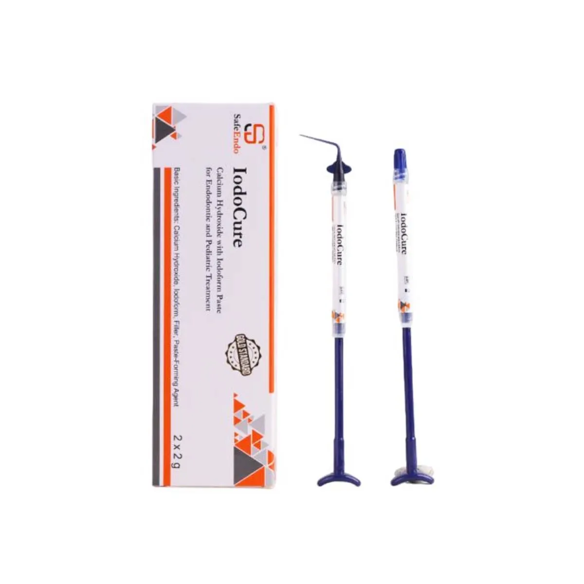SafeEndo IodoCure calcium Hydroxide paste with iodoform (Radiopaque), used as temporary or permanent root filling material.