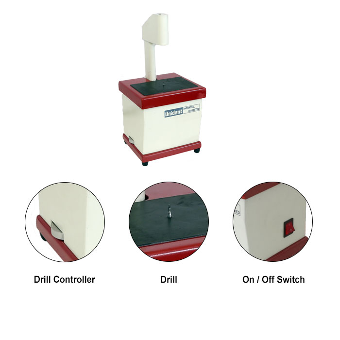 Unident Laser Pin Machine is used for the preparation of porcelain teeth. It is mainly used in the processing plaster molds and plaster nails. It has the advantages of high rotational speed, low noise, high precision and easy operation. This machine has a laser positioning system. The working platform and the main axis match precisely which ensure the quality of drilling. The depth of drilling can be adjusted by a rotary switch. The minimum adjusting depth is 0.15mm.